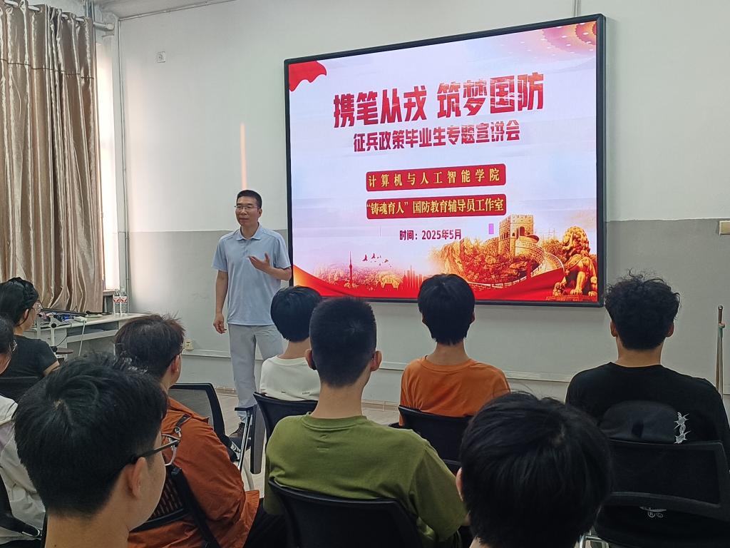 承办的“携笔从戎,筑梦国防”征兵政策毕业生专题宣讲会于5月16日在燕山校区举办。活动由“铸魂育人”国防教育辅导员工作室主持人、学院学工(就业)办主任任楠担任主讲,宣讲会通过线上线下同步开展,吸引了300余名应届毕业生及部分低年级学生参与。
