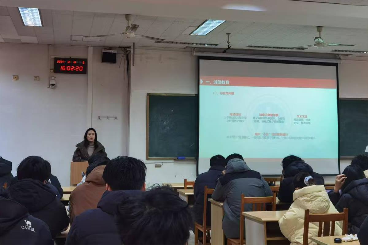 为深入学习贯彻落实习近平总书记在全国教育大会上的重要讲话精神,全面贯彻党的教育方针,增强在校学生诚信意识和责任意识,营造诚实守信的校园氛围,规范学风学纪,严肃考风考纪,近日,学院各班举办了学风建设主题班会,辅导员及全体学生参加。