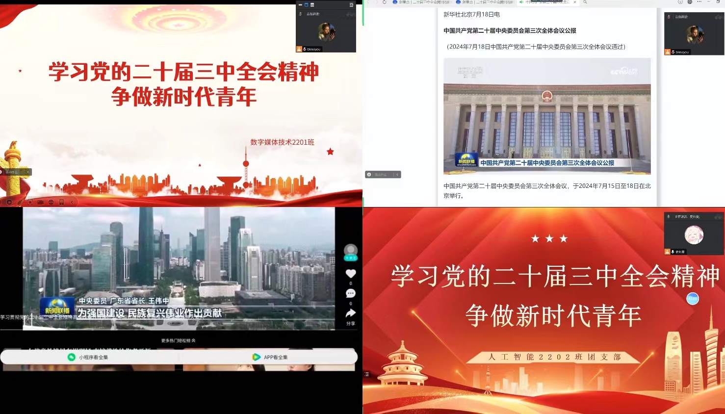 学院各级团组织召开了以“学习党的二十届三中全会精神,争做新时代青年”为中心的主题团日活动,通过专题学习、研讨交流等形式,充分利用多媒体和数字化设备,多样化开展学习宣讲。数字媒体技术2201班团支部在支部书记亓琪的带领下,认真学习党的二十届三中全会内容,深刻领悟会议精神。支部团员就“教育、科技、人才是中国式现代化的基础性、战略性支撑”展开讨论,表示中国式现代化为我们提供了广阔舞台。亓琪鼓励同学们作为青年,要肩负时代重任,直面挑战,抓住机遇,以饱满的热情投身到国家建设和改革中,以青春之我创造青春之国家,为实现中华民族伟大复兴的中国梦不懈奋斗。