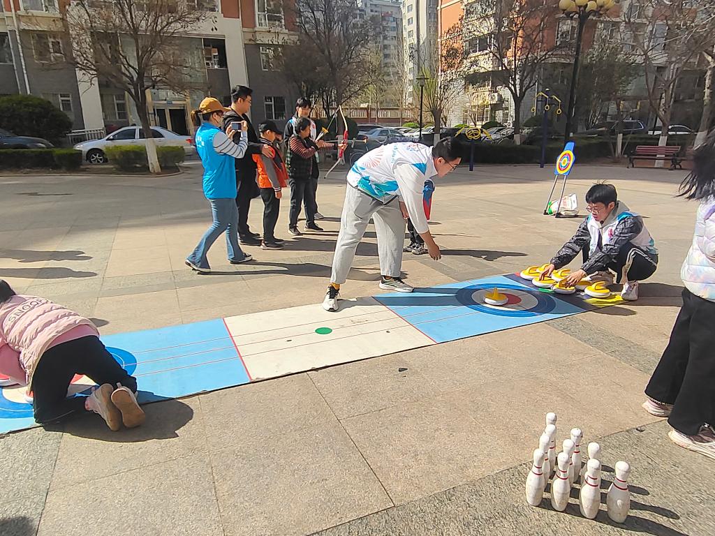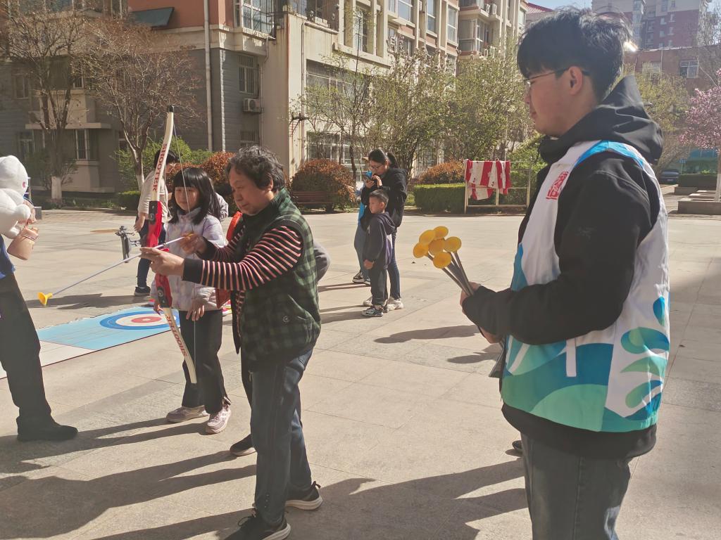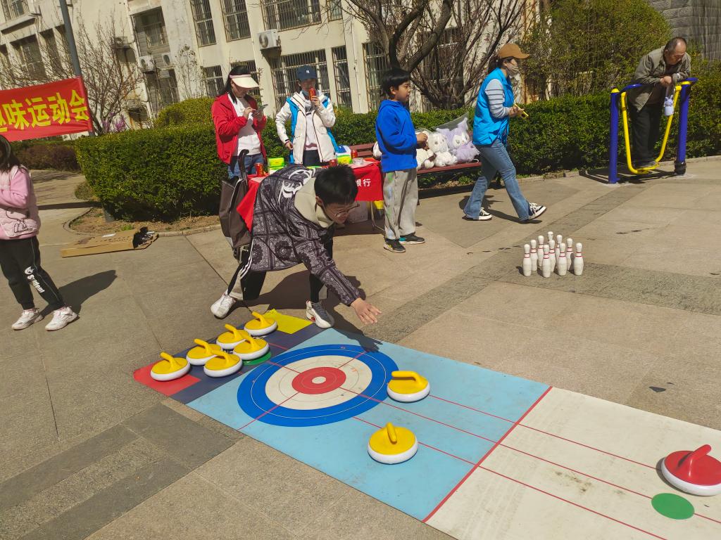 趣味运动会遵循“重在参与、康乐兼备”的宗旨,锻炼与娱乐并重,健康和趣味同行。运动会设置了迷你保龄球、陆上冰壶、射箭打靶等项目,参加者大多数为中老年人群和少年儿童,“亲子趣味赛”成为一大亮点,爷爷奶奶与孩子们共同参与跳绳、袋鼠跳等项目,温馨互动的画面洋溢着家庭的欢乐与亲情的温暖。在社区工作人员和学生志愿者的指导服务下,整个活动现场气氛热烈,井然有序,加油声、欢笑声此起彼伏,社区居民们“玩”得不亦乐乎,志愿者们也“忙”得乐在其中,他们积极组织社区居民参与互动游戏,协助参赛者进行项目体验,春日的暖阳映照出一幅幅生动和谐的社区生活图景。