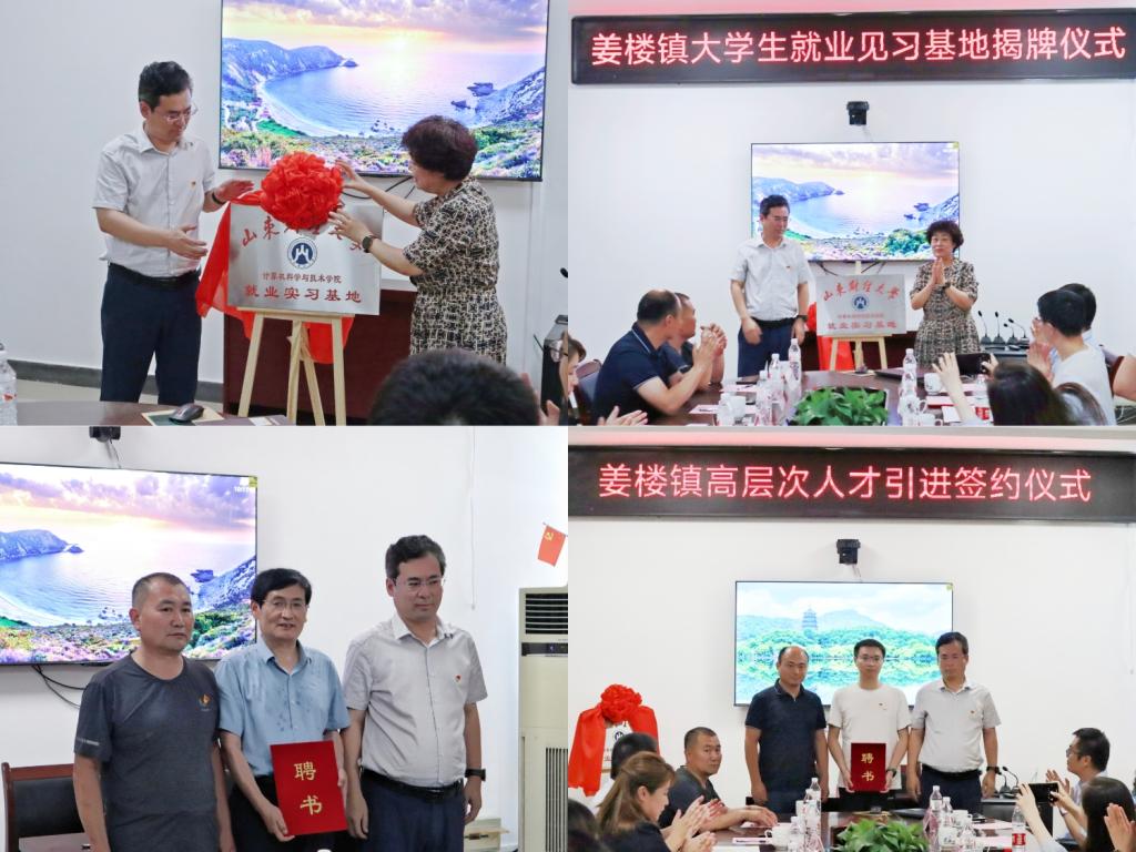 计算机科学与技术学院,卢勇代表姜楼镇政府签署了人才柔性引进专家协议,并为引进专家颁发聘任证书。杨春丽和卢勇共同为大学生就业见习基地揭牌。