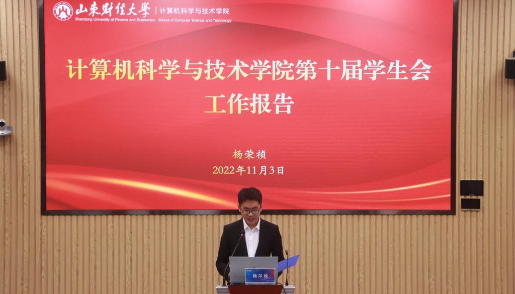 随后,学院第十届学生会主席杨荣祯作工作报告。杨荣祯从队伍建设、志愿服务、校园文化、创新实践、第二课堂和就业服务六个方面对过去一年学院学生会工作进行了总结和汇报。一年以来,学生会一路走来,在学校学院党委和团委的指导关怀下,向着太阳,稳扎稳打,阔步前行。开展“第九届计算机文化节”“中国计算机设计大赛校赛选拔赛”等校级活动十余场;特别是在建党100周年之际,举办红歌赛、红色故事分享会和“百年百天”百日计划系列学习教育;疫情防控期间,展现魅力“蓝”,冲在第一线,为全校核酸检测和社区疫苗接种提供志愿服务,任劳任怨,得到学校各部门一致好评。最后,杨荣祯分享了自己在学生会的蜕变、成长和感恩,同时与新一届学生会共勉,提醒他们,要时刻警醒自己,审视自己,要恪守学生本分,牢记服务宗旨,摒弃庸俗习气,勤勉务实做事,永葆理想情怀。