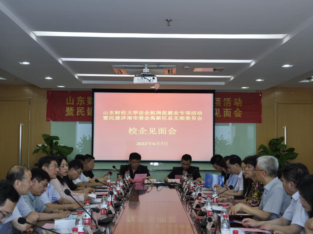 民建济南市委高新区总支部委员会主委杨俊勇对我校访企拓岗活动表示热烈欢迎和大力支持。济南高新区管委会发展保障部就业保障办公室副主任张伟、人才统战办公室副主任丁一涵分别介绍了济南高新区在高校毕业生就业创业服务、人才补贴等相关优惠政策,并欢迎山财大毕业生到高新区求职就业。