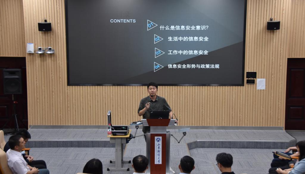 为增强学生网络安全意识,6月17日下午,学院邀请山东省教育科学研究院信息中心主任徐长棣、薛峰、郑兆娜一行,到学院开展“网络与信息安全”主题宣传校园行活动。省教科院特约讲师、山东云天安全技术有限公司胡建秋担任本次讲座的主讲人。学校审计处董彬老师,学院党委书记王有志,学院党委副书记李振华出席本次讲座。讲座由学院学工办主任李云枝主持。19级、20级150余名同学参加此次讲座。