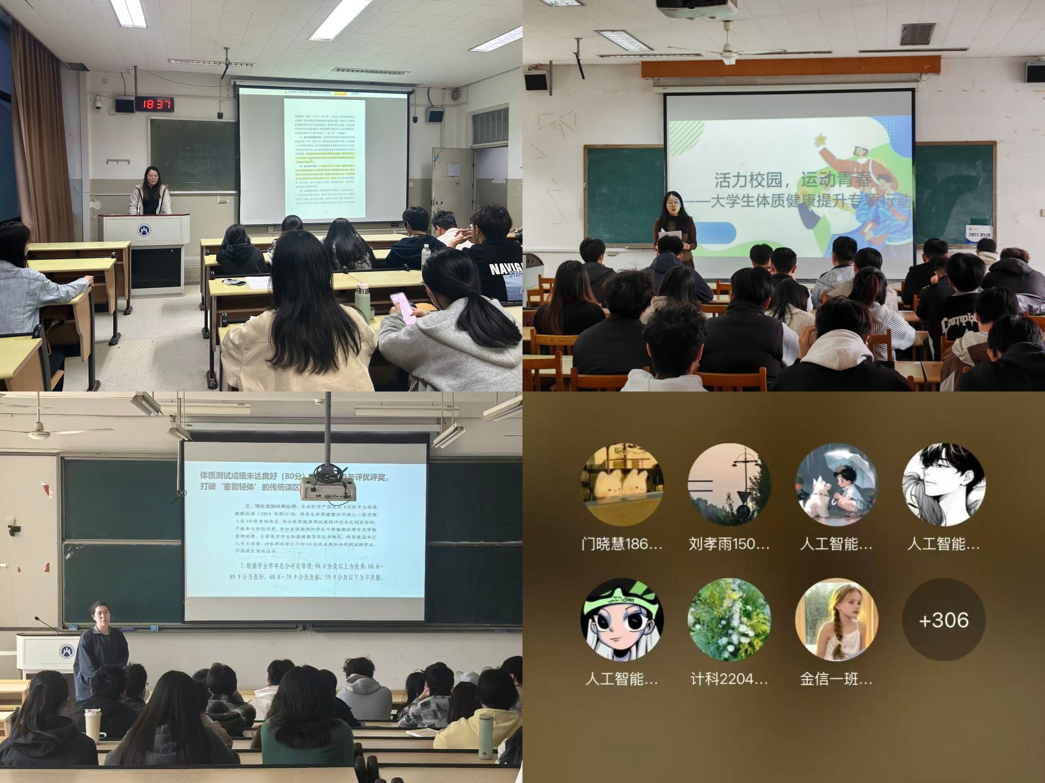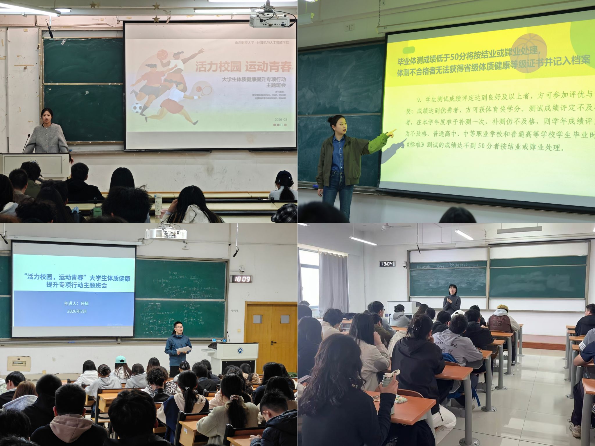 班会上,辅导员围绕“健康第一”的教育理念,结合教育部及山东省教育厅相关文件精神,从政策背景、体测标准、日常锻炼等方面进行系统解读。针对低年级学生,重点帮助其尽快熟悉体质健康标准与校园锻炼制度,树立健康意识。针对中高年级学生,考虑到他们面临学业与就业双重压力的实际情况,注重分析规律性体育锻炼对身心健康的积极作用,鼓励同学们充分利用校内外体育资源,每周至少参加3次有强度的课外锻炼。