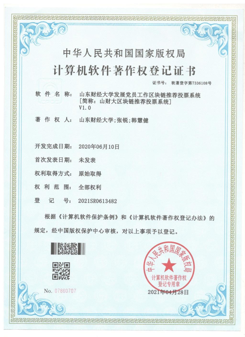 系统具有管理员、学校组织部、学院管理员、辅导员和学生五种角色,实现入党积极分子、发展对象和预备党员三种类型的投票;系统管理员可以设置系统菜单、管理系统角色和投票类型等;学校组织部可以定制投票活动时间并发布活动;学院管理员管理学院班级和辅导员;辅导员设置班级候选人和预备党员投票权限、班级投票时间并发布班级投票、查看投票情况及投票结果,进行区块链数据校验等;学生可在投票时间范围内登录后选择候选人输入验证码即可进行投票,投票界面简单、操作方便; 投票数据上传到蚂蚁区块链Bass平台,并提供验证和区块链存证证书,确保数据安全、保密、可追溯、不可篡改,保证投票公平、公正,保障疫情期间发展党员工作顺利进行。
